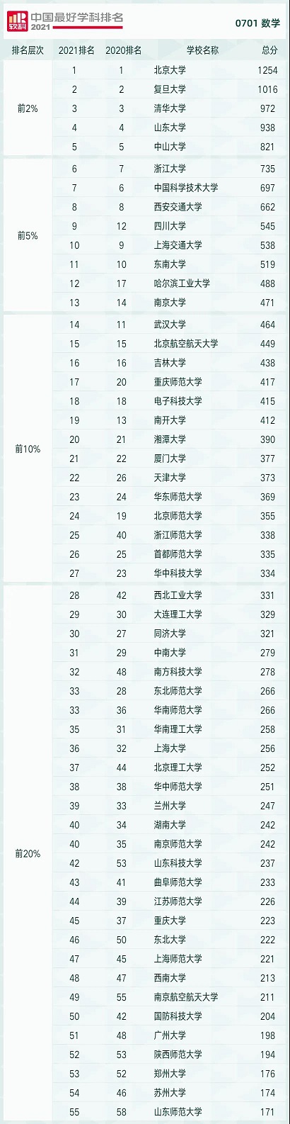2021软科中国最好学科排名发布,我校数学学科排名第五