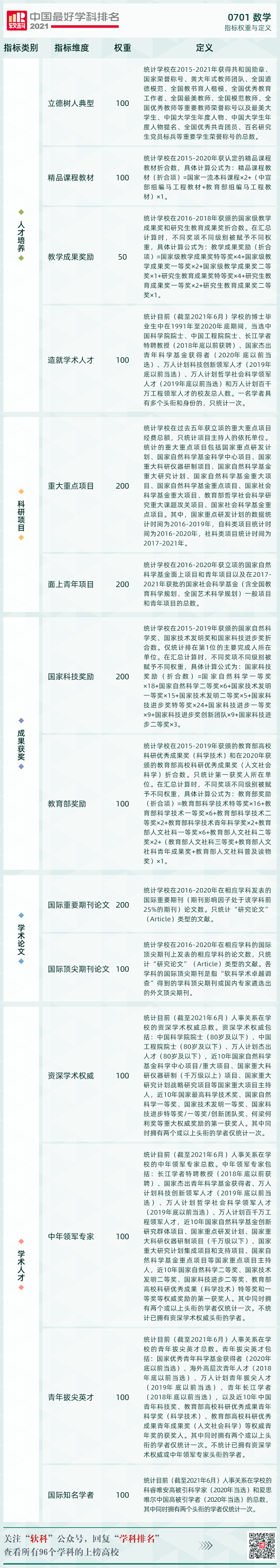 软科中国最好学科排名的指标体系包括人才培养、科研项目、成果获奖、学术论文、学术人才五个指标类别,下设17个指标维度,共计50余项反映学科竞争力的客观量化指标,涉及百余项观测变量。由于部分指标在不同学科门类的适用性和重要性存在差别,因此中国最好学科排名在不同学科采用差异化的指标体系。数学学科的指标权重与定义如下: