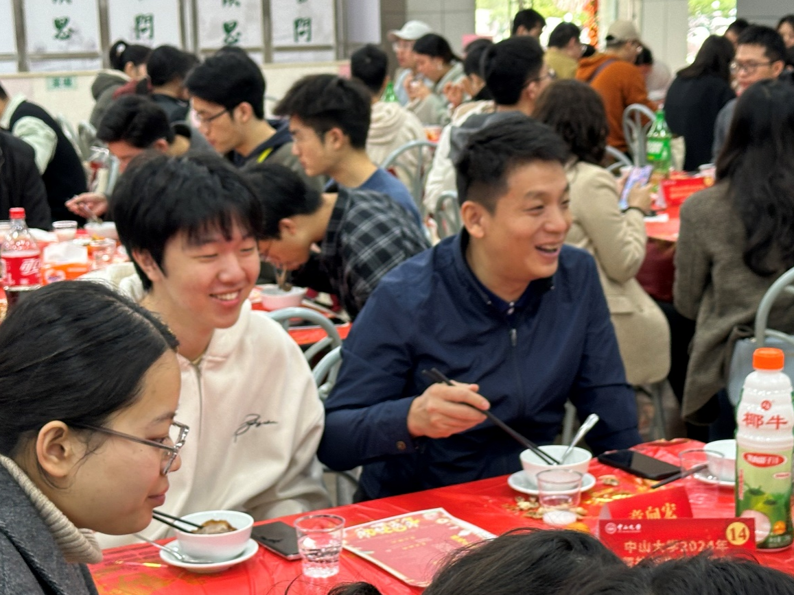 在活动中,章向宏老师与学院留校同学深入交流,亲切询问同学们家乡的春节习俗,了解他们的留校学习与生活。他向同学们介绍了聚餐活动中的传统广州粤菜,还分享了广州花市等传统的春节活动,让同学们感受到浓厚的广州年味。交谈中,老师和同学们相互送上了新春的祝福,章老师也转达了学院对同学们的关心和期望。他说,努力学习不松懈的同时,开心、充实的度过美好的大学生活也很重要,同学们应珍惜大学宝贵的时光,努力奋斗,为自己将来的成长打下坚实基础。在聚餐结束时,大家一起合影留念。