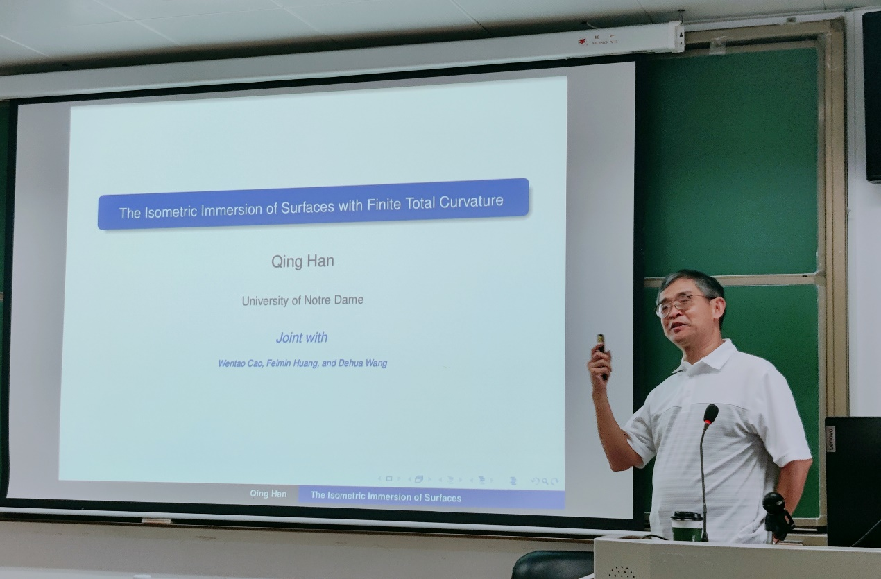 报告会上,韩青教授首先回顾了微分几何领域重要课题等距浸入问题的相关历史。他介绍了著名的Nash嵌入定理和众多优秀数学家在整体问题、局部问题以及不同维数下的研究成果,清晰地展示了等距浸入问题的研究脉络。紧接着,韩青教授分享了他对等距浸入问题现今存在的困难、未来发展的深刻见解,并介绍了他与合作者们在具有负高斯曲率和有限总曲率的曲面的等距浸入问题上的最新工作。