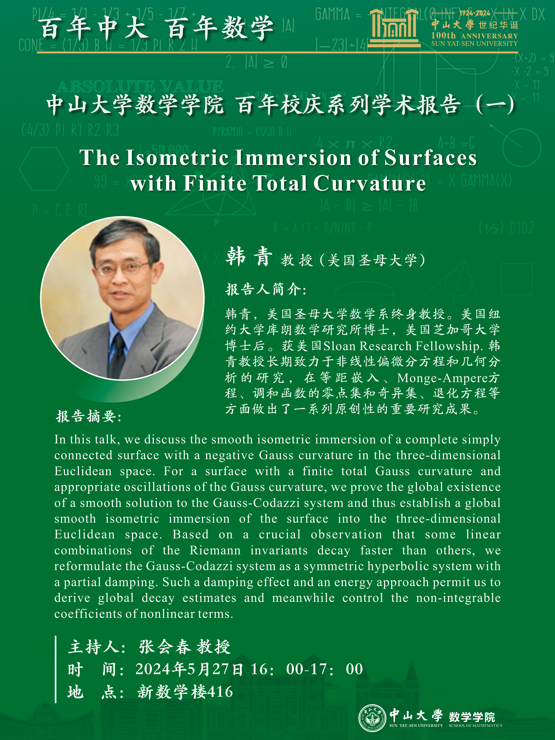 正逢中山大学百年华诞,为献礼百年校庆,回顾数学百年发展历程,传承良好学术传统,展望数学百年新出发,yl88858永利集团筹划“百年中大,百年数学系列学术报告。