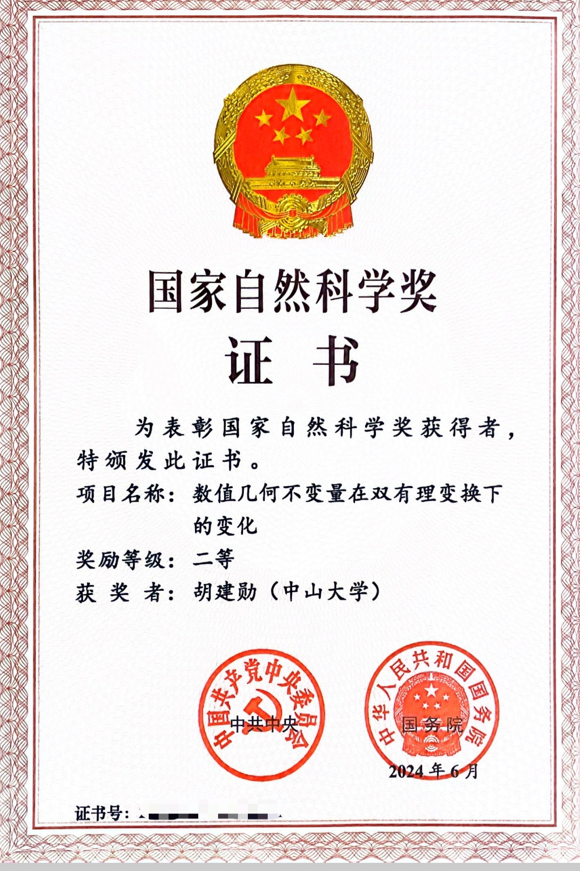 6月24日,中共中央、国务院在北京隆重举行2023年度国家科学技术奖励大会。中共中央总书记、国家主席、中央军委主席习近平为国家最高科学技术奖获得者等颁奖并发表重要讲话。我院胡建勋教授等完成的“数值几何不变量在双有理变换下的变化”项目获得自然科学奖二等奖。