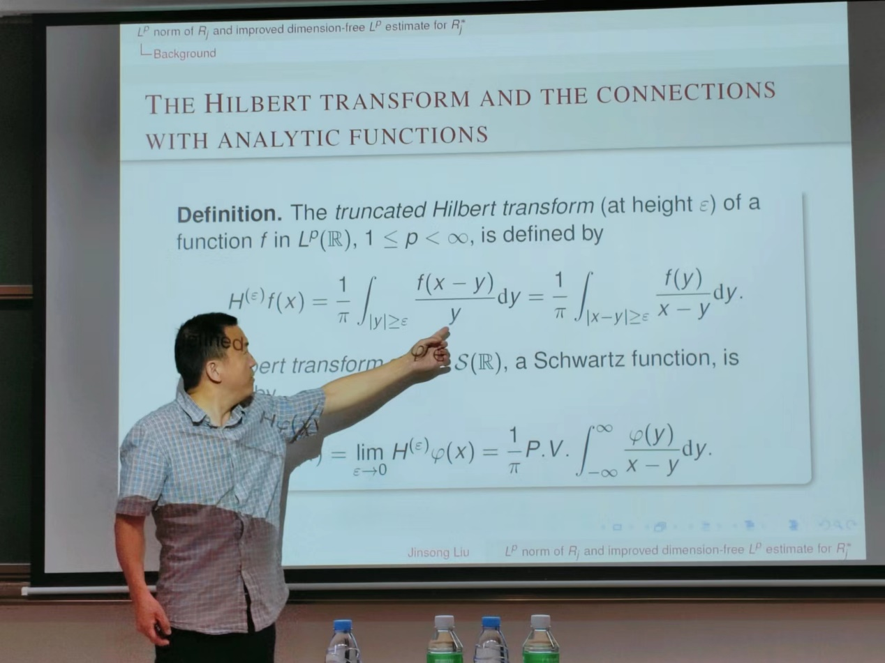 在报告中,刘劲松研究员分享了他在调和分析领域最新的研究工作,借助于复分析中贝塞尔函数的估计,刘劲松及其合作者给出了极大穿孔Riesz变换的不依赖于维数的上界估计。