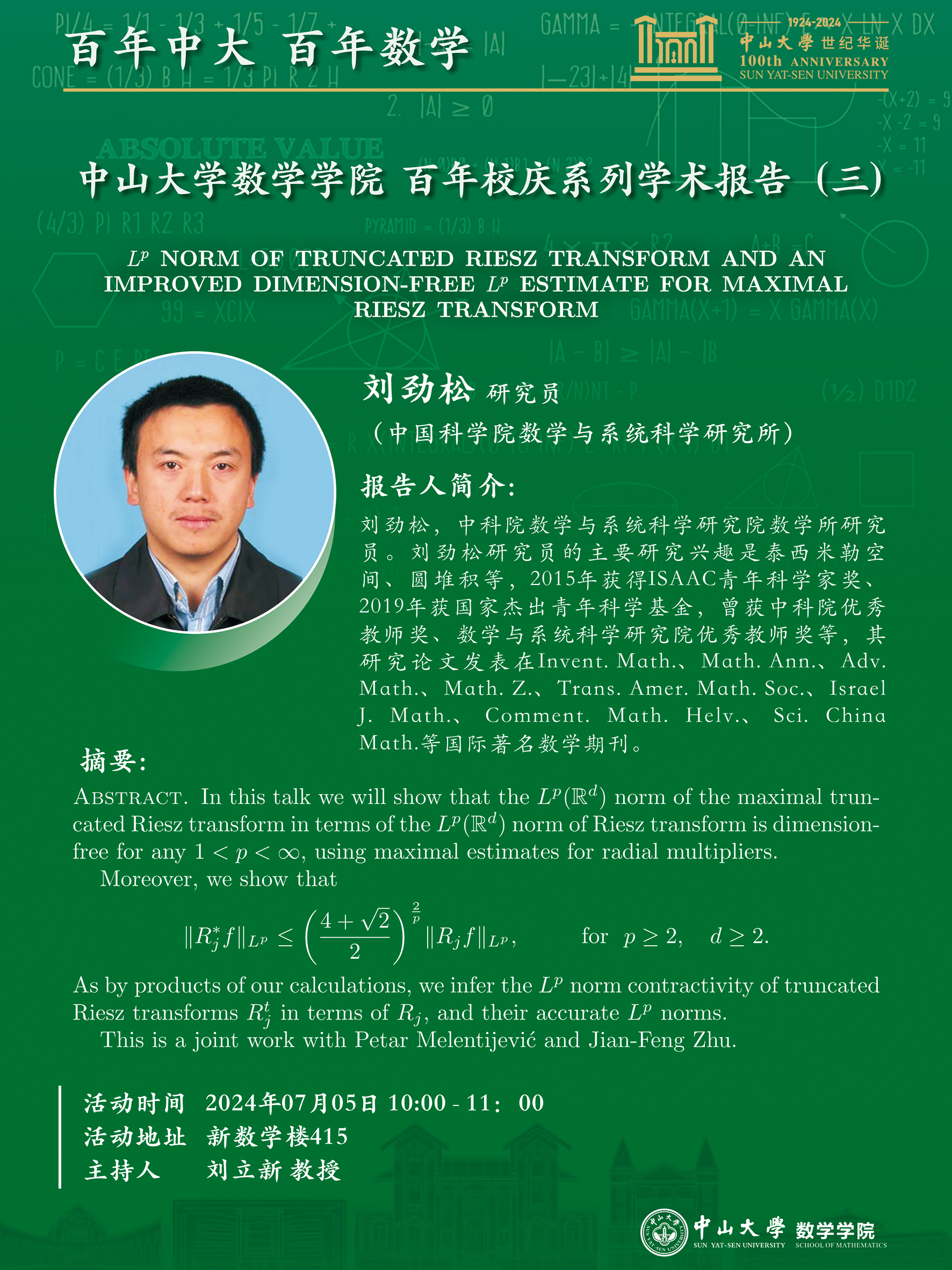2024年7月5日,应我院刘立新教授和苏伟旭教授的邀请,中国科学院数学与系统科学研究院数学所刘劲松研究员在新数学楼415室作题为《LP NORM OF TRUNCATED RIESZ TRANSFORM AND ANIMPROVED DIMENSION-FREE LP ESTIMATE FOR MAXIMALRIESZ TRANSFORMAMM》的学术报告。